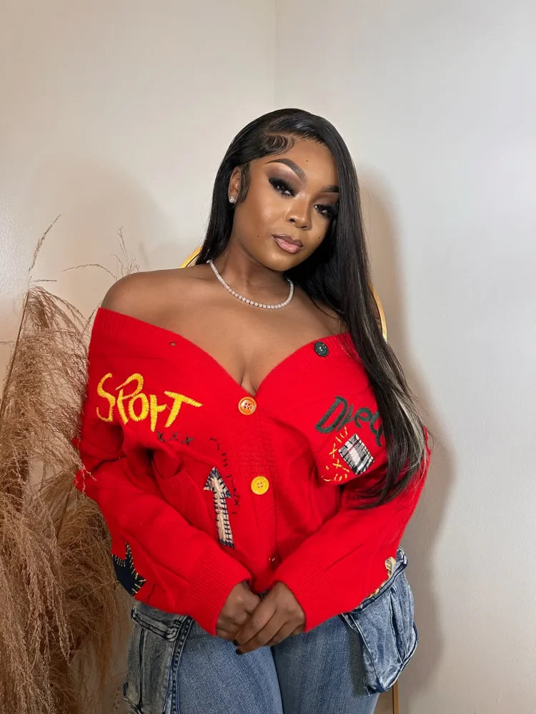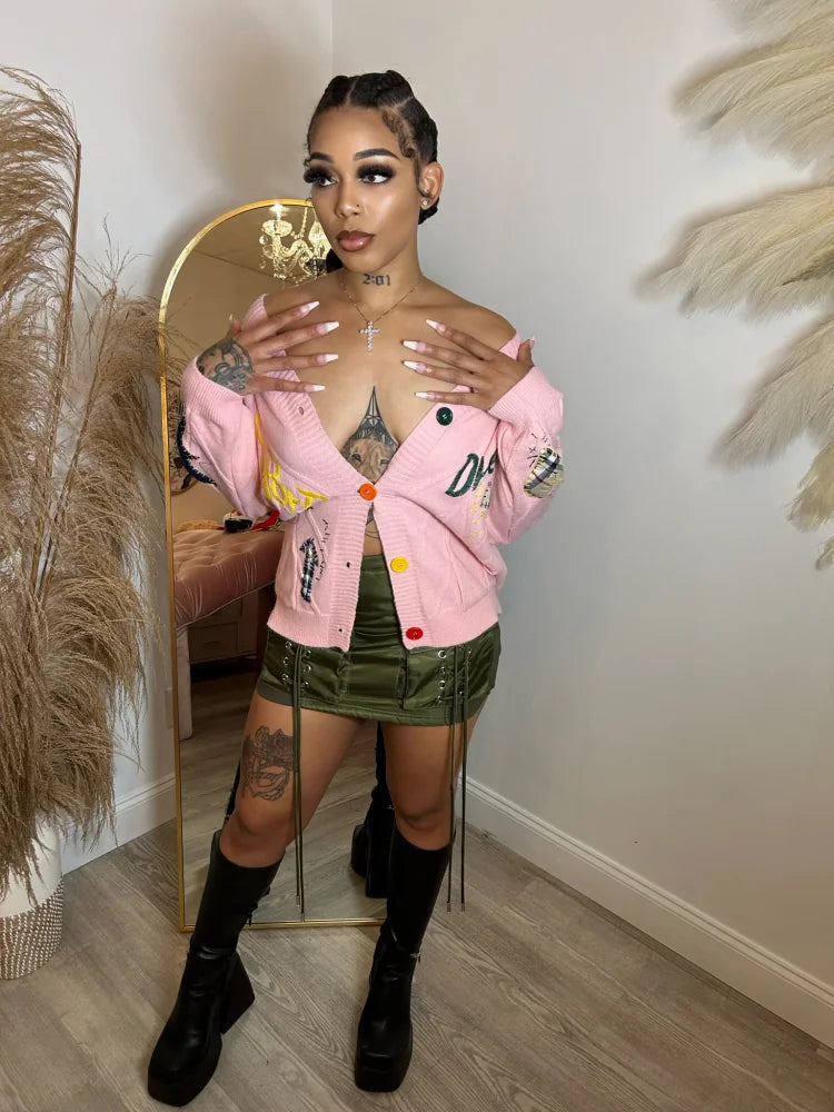Add an embroidered touch to your wardrobe with this loose V-neck cardigan. Perfect for layering, this cardigan boasts a playful and quirky vibe with its unique letter embroidery. Stay cozy and stylish with this must-have piece.